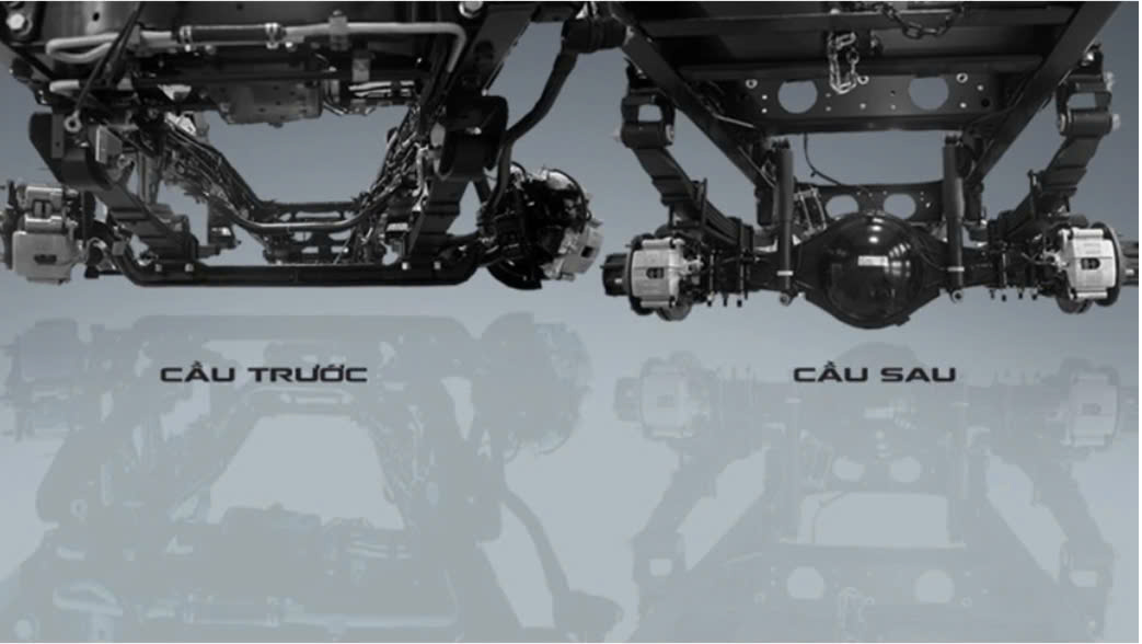 Cầu trước: Dầm chữ “I” Cầu sau: Khả năng chịu tải lớn. tỷ số truyền cầu lớn, cứng vững, vận hành mạnh mẽ. Tính ổn định cao, độ cứng xoắn và chống uốn cao, khả năng chịu tải lớn. Chassis được sơn nhúng tỉnh điện ED, sơn chống gỉ sét và gia tăng độ cứng bề mặt, độ bền cao. Mối ghép li-vê bố trí tại mặt bên khung chassis. Góc lật cabin lớn ( 60o) thuận tiện cho việc bảo dưỡng. Cầu trước: Kết cấu dầm chữ "I", cứng vững, tăng khả năng chịu tải. Cầu sau: Tỷ số truyền lớn, vận hành mạnh mẽ, phù hợp với mọi địa hình khác nhau.