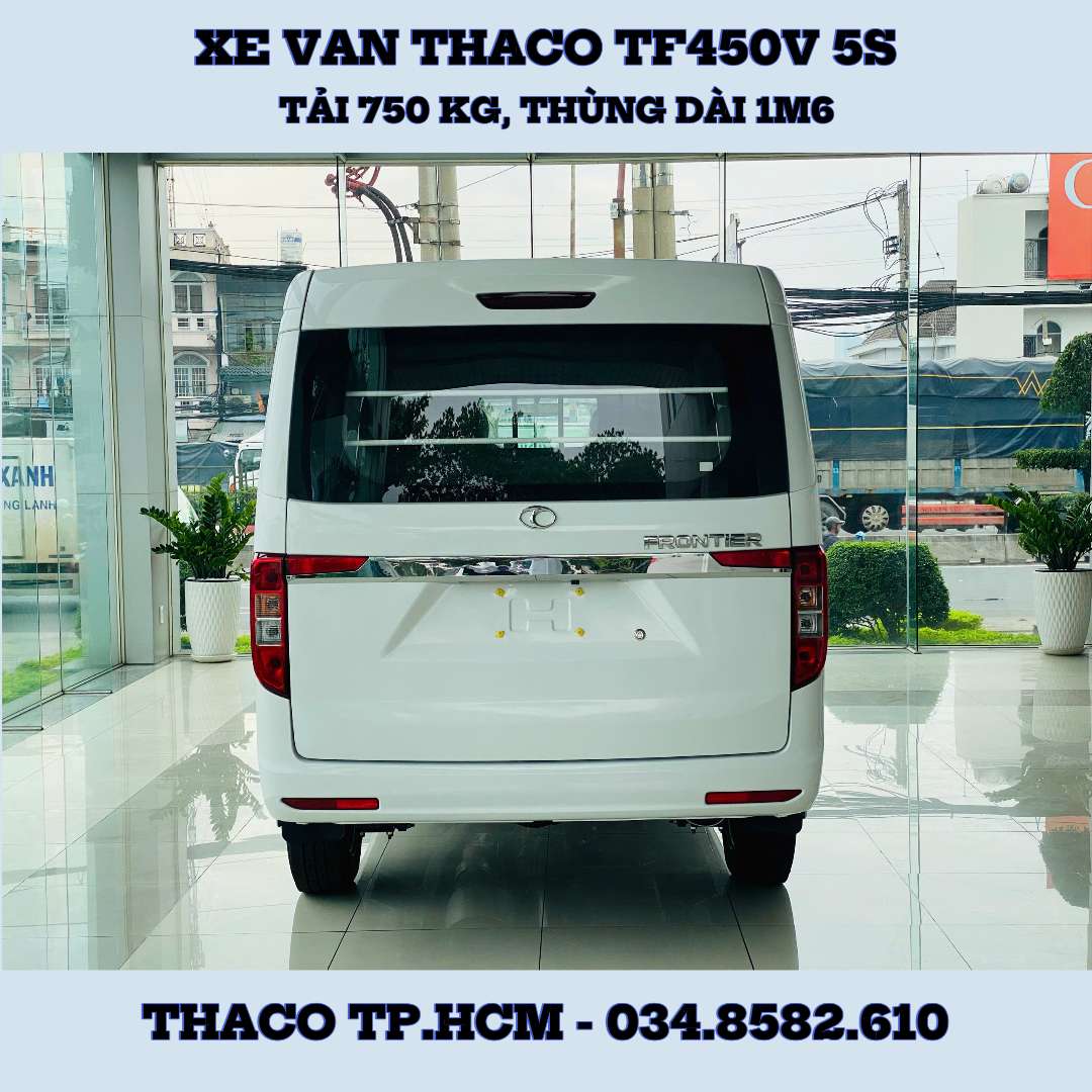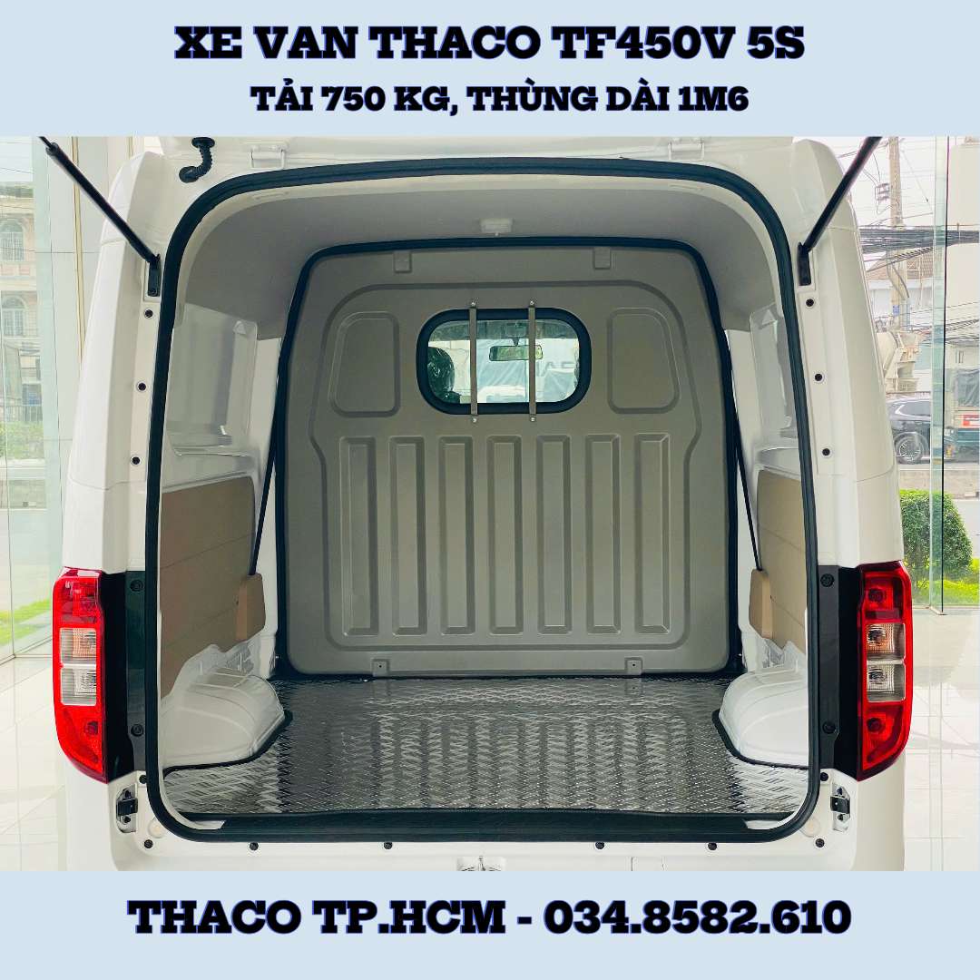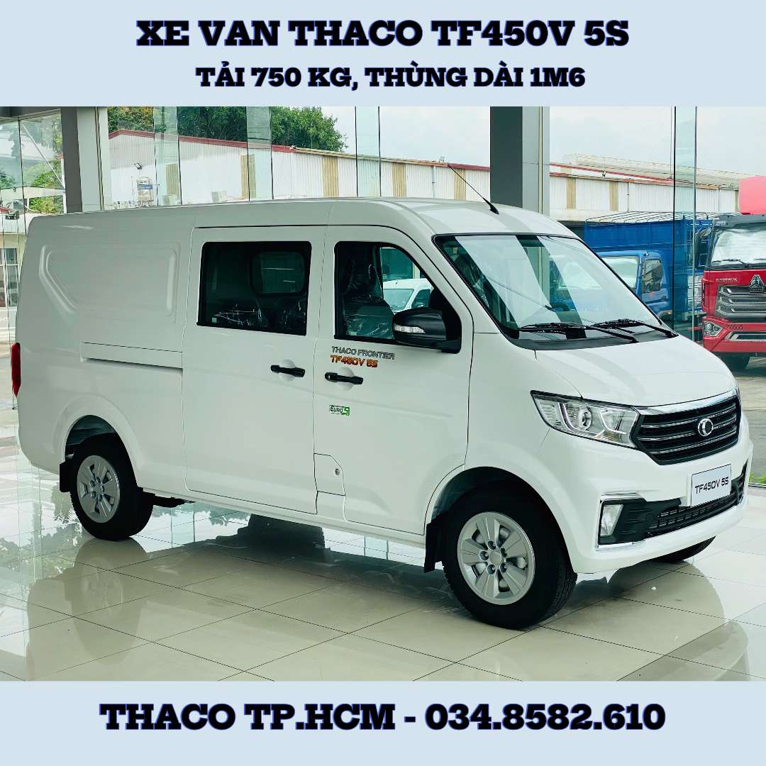 Hiện tại giá xe Van Thaco TF450V 5S thùng dài 1m6 tải trọng 750 kg niêm yết tại TP.HCM là 349 triệu. Quý khách vui lòng gọi 034.8582.610 để nhận giá lăn bánh chính xác nhất và biết thêm về các chương trình khuyến mãi hiện đang có tại showroom