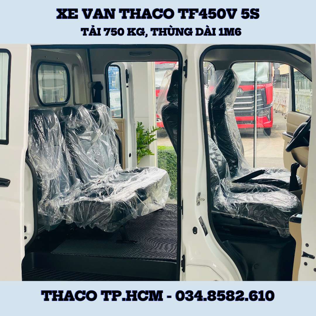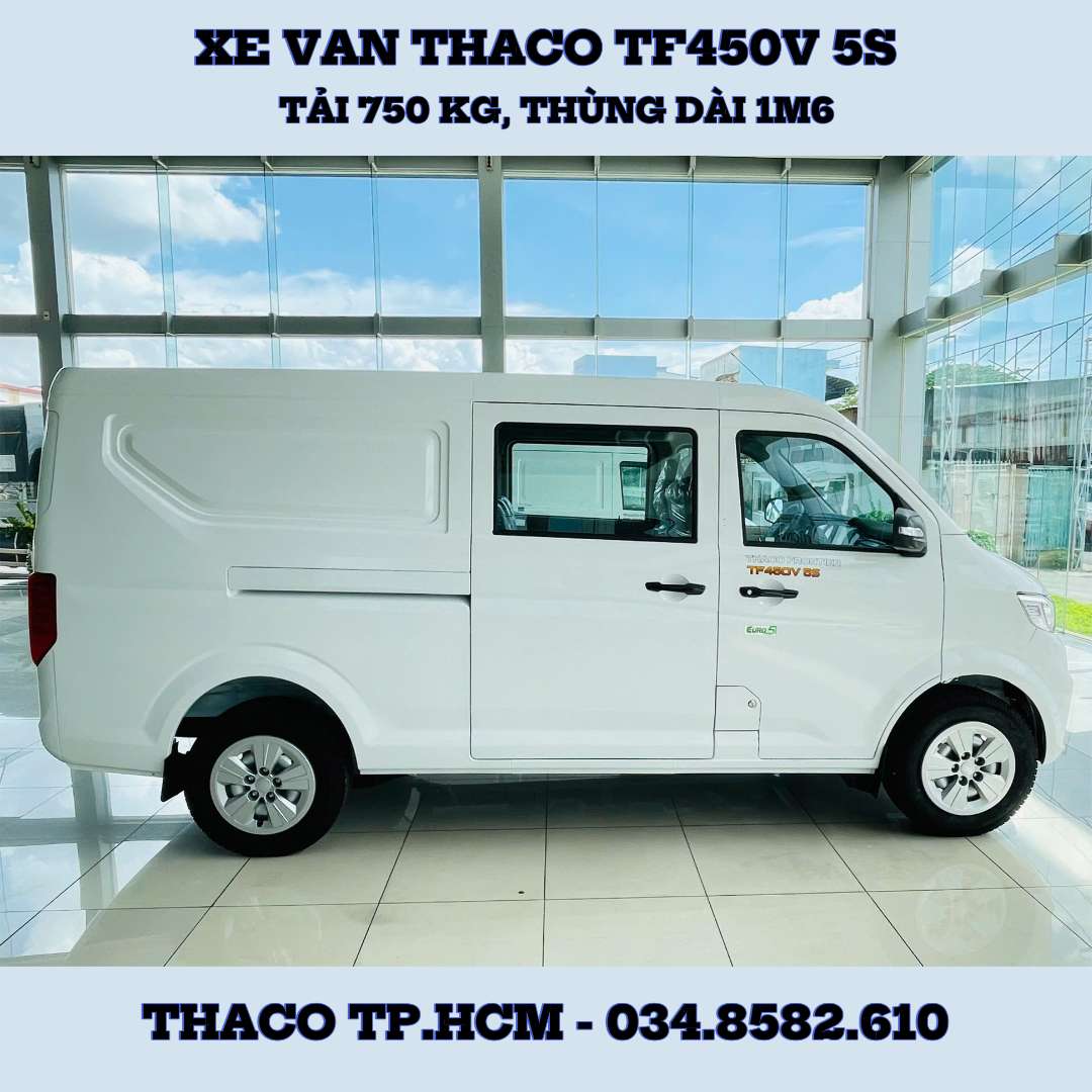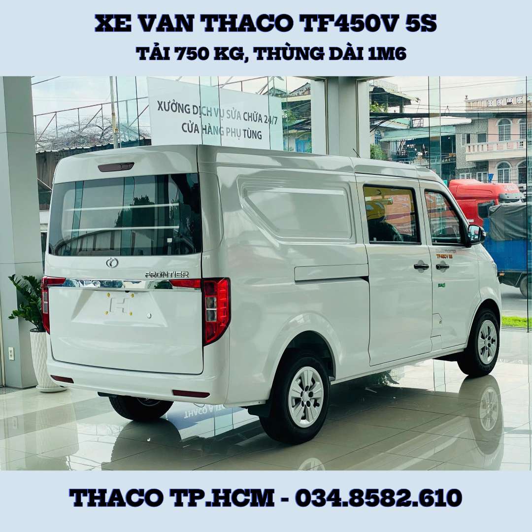 Hiện tại giá xe Van Thaco TF450V 5S thùng dài 1m6 tải trọng 750 kg niêm yết tại TP.HCM là 349 triệu. Quý khách vui lòng gọi 034.8582.610 để nhận giá lăn bánh chính xác nhất và biết thêm về các chương trình khuyến mãi hiện đang có tại showroom